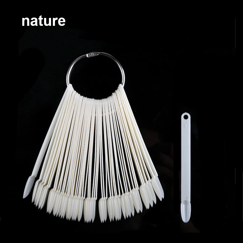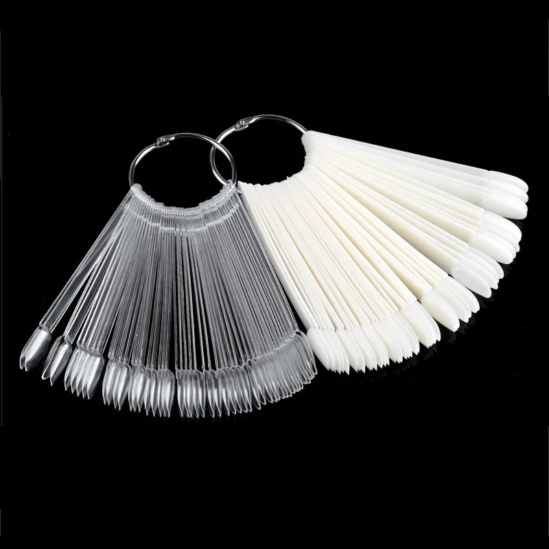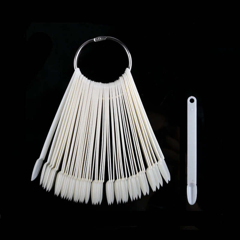 50Pcs Nail Swatch Sticks with Ring, Fan Shape Nail Art Polish Display Tips, False Nail Sample Practice SticksSpecification:Quantity: 50 Pcs/BagColor: Transparent and NaturalSize: Approx 12.2*5.7cmTips Hand Shape: RoundPackage Included: 50pcs false nail tips.Feature:Create your own color display chartEasy to show up your nail polishSuitable for Nail Art Salon / Manicure / Pedicure, also can be used for practicing nail art painting.This nail art color display chart can help you to sort out your colourful nail art polish.Your client may be perfectly satisfied by this nail art color display chart.