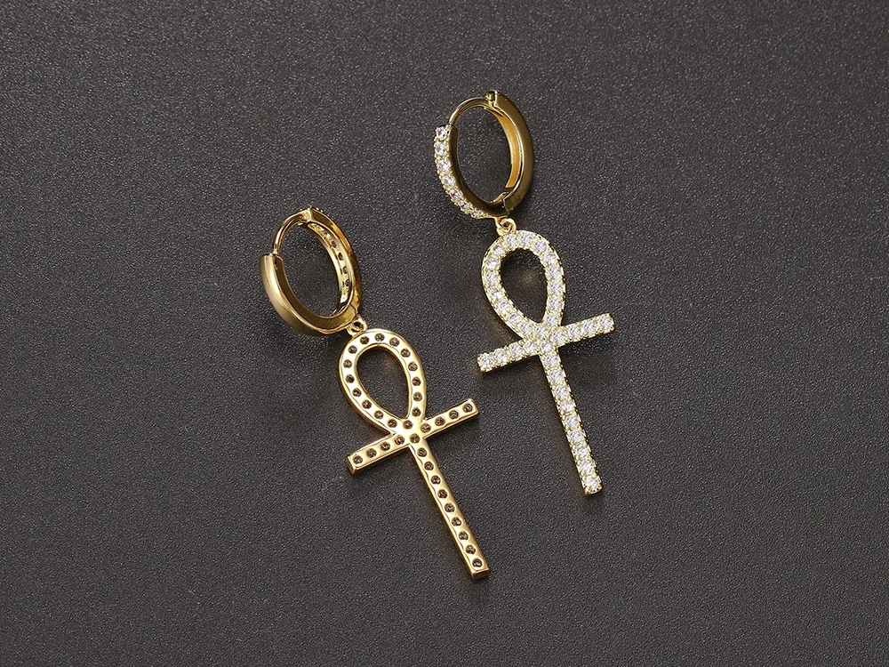 Hip Hop Ankh Dangle Hoop Earrings For Men Rock Punk Accessories Iced Out Zircon
