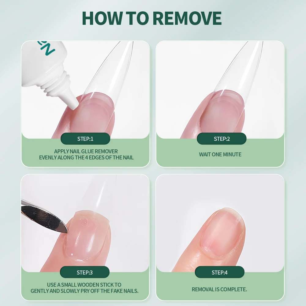 1.Apply nail glue remover evenly along the 4 edges of the nail. 2.wait one minute. 3.Use a small wooden stick to gently and slowly pry off the fake nails.
