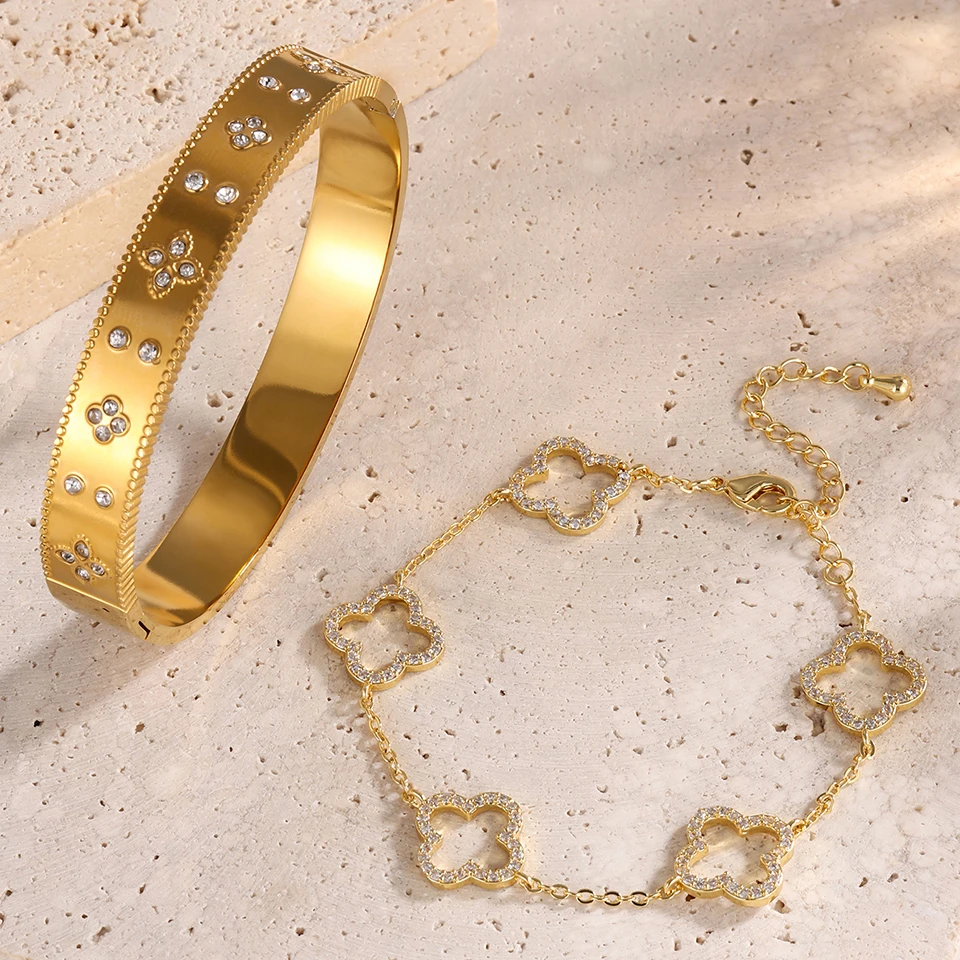ZAKOL 2 Pieces Stainless Steel Clover Bracelet Bangles Shiny Zircon Hollow Four-